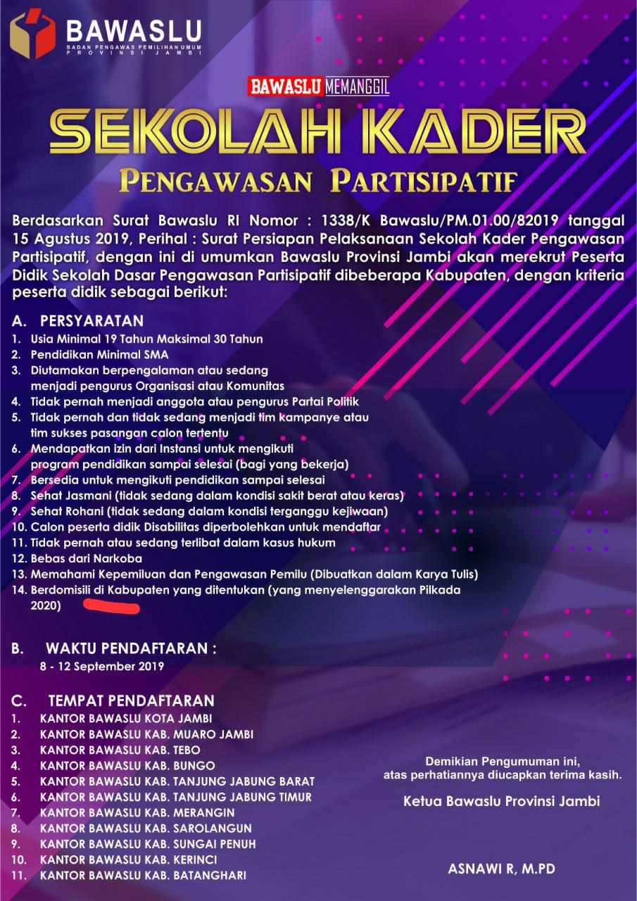 Jambi, Badan Pengawas Pemilihan Umum – Badan Pengawas Pemilihan Umum (Bawaslu) akhirnya secara resmi mengumumkan penerimaan Sekolah Kader Pengawas Pemilu (SKPP). Proses Pendidikan dan Latihan (Diklat) Sekolah Kader Pengawasan Pemilu(SKPP) ini ditujukan untuk daerah yang akan melaksanakan pilkada serentak pada 2020 mendatang.