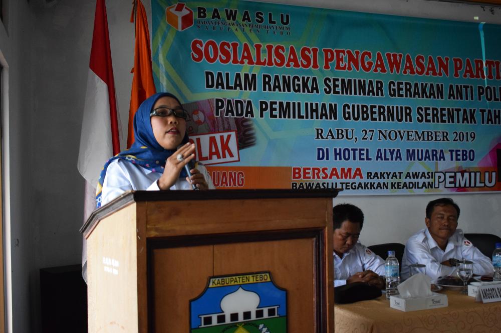 Rabu 27 November 2019 Bawaslu Kabupaten Tebo mengadakan Solisasi Pengawasan Partisipasi dalam rangka seminar gerakan anti politik uang pada pemilihan Gubernur tahun 2020.